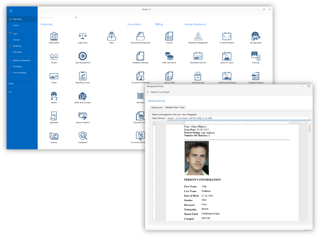 Integrate with popular tools including Microsoft Office and Outlook, and specialist systems including banks, accounting tools, MemberCheck (background checks), LexisNexis, ShuftiPro (ID Verification), and provides an Open API Architecture to facilitate other integrations.