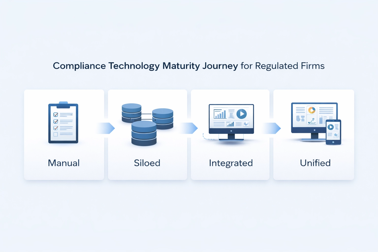 The final stage is unified and inspection-ready, where compliance workflows, risk data, documentation, and audit trails exist within one operational environment.