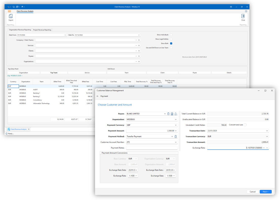 Gain insights into all areas of your revenue cycle using inbuilt reports and customizable dashboards. Standard reports include Aged WIP, Aged Invoices, Revenue Analysis, Profitability. With your business information in the same system you gain insights such as revenue per client risk profile.